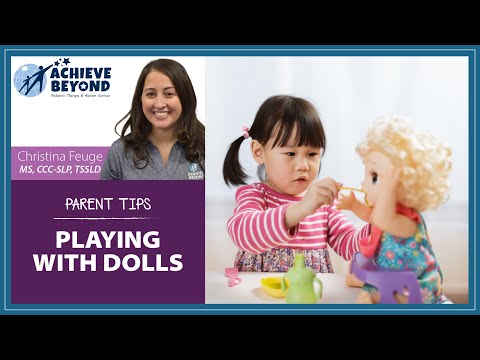 Hi, my name is Christina Feuge and I am the Speech Clinical Director at Achieve Beyond. Today, I’m going to share with you some ways to expand your child’s pretend play skills. All you will need is your child’s favorite doll, stuffed animal or action figure, and some accessories to help expand play. You can use a small blanket or towel, a bowl, cup, and a spoon. Show your child an action, such as sleep with the doll by laying the doll on the floor and covering the doll with a blanket. Other action words you can teach your child during this activity are eat, drink, cry, kiss and hug.
